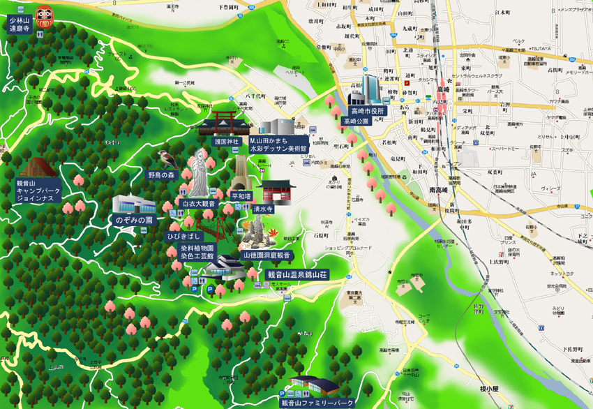 1. 徒歩で行く場合は高崎駅西口よりまず、高崎市役所に向う。 ぶつかって右、次の信号を左と進みあとは真っ直ぐひたすら歩く。 国道17号を横切り、和田橋を渡りただひたすらに歩くと護国神社にぶつかる。 ここから左の道を約10分ほど山登りで駐車場。 秋に行われるだるまマーチは徒歩で高崎観音山周辺をコースにして歩く。1時間はかかる。
